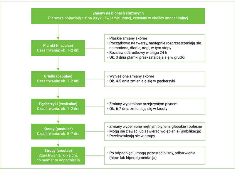 Zmiany skórne przybierają postać plamek, grudek z pępkowatym zagłębieniem, pęcherzyków, krost, owrzodzeń. Pokrywają się strupem, następnie przysychają i odpadają, pozostawiając przebarwienie na skórze. Zazwyczaj na początku choroby zmiany przyjmują postać grudek lub plamek – nie jest to jednak regułą. U pacjentów obserwowano zarówno zmiany monomorficzne (w większości przypadków), jak i różne formy morfologiczne w tym samym czasie bądź pominięcie form pośrednich (np. bezpośrednią zmianę z grudki we wrzód)6. Zmiany są dobrze odgraniczone od zdrowej skóry, mogą być otoczone rumieniową obwódką. Wykwity bywają bolesne lub swędzące7. Wysypka utrzymuje się na skórze przez mniej więcej 3-4 tygodnie. Po odpadnięciu strupów pacjent przestaje być uważany za zakaźnego5.