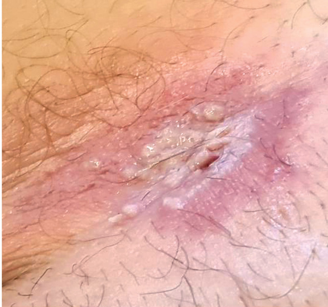 Rycina 2. Zmiany skórne w przebiegu Mpox zlokalizowane w okolicy anogenitalnej (źródło: archiwum Katedry Chorób Zakaźnych UJ CM)