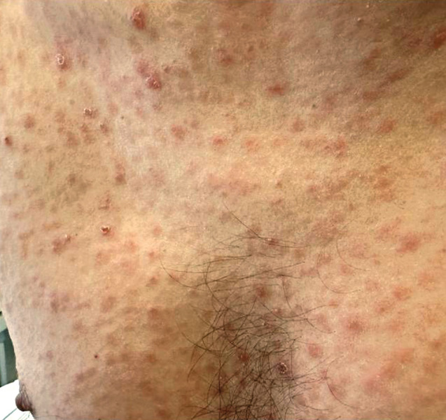 Rycina 3. Zmiany skórne w przebiegu Mpox zlokalizowane na klatce piersiowej (źródło: archiwum Katedry Chorób Zakaźnych UJ CM)