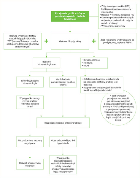 Ze względu na wiele różnych postaci klinicznych przypominających inne, powszechniej stwierdzane choroby rozpoznanie rzadko występującej gruźlicy skórnej jest bardzo trudne. Często różnicuje się ją z takimi schorzeniami, jak sarkoidoza, toczeń rumieniowaty krążkowy, rak podstawnokomórkowy, leiszmanioza skórna, trąd, zakażenia mykobakteriami atypowymi, promienica, kiła, infekcje grzybicze, hidradenitis suppurativa lub brodawki wirusowe. Kolejną trudnością są częste wyniki ujemne w testach diagnostycznych stanowiących złoty standard. Dlatego też na podejrzenie gruźlicy skóry ma wpływ przede wszystkim wywiad chorobowy i środowiskowy pacjenta, a w przypadku badań laboratoryjnych – zgodnie z definicją gruźlicy pozapłucnej wg Światowej Organizacji Zdrowia (WHO – World Health Organization) – wystarczy potwierdzić obecność prątków M. tuberculosis przynajmniej w jednej z próbek materiału pobranego ze zmian. Jeżeli obraz kliniczny lub badanie histologiczne wskazują na proces gruźliczy, zalecane jest włączenie leczenia ogólnego6,8.