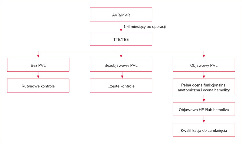 W opublikowanych w 2025 r. wytycznych ESC znajdują się również zalecenia postępowania w przypadku stwierdzenia PVL. Przede wszystkim zaleca się, aby decyzję co do sposobu leczenia (chirurgiczne lub przezcewnikowe) podejmować na posiedzeniu kardiogrupy (heart team) po ocenie ryzyka, morfologii przecieku oraz doświadczenia ośrodka. Reoperację zaleca się, jeżeli PVL jest związany z zapaleniem wsierdzia lub powoduje hemolizę wymagającą powtarzanych przetoczeń krwi bądź prowadzącą do nasilonych objawów niewydolności serca. Należy rozważyć przezcewnikowe zamknięcie kwalifikującego się do takiego leczenia PVL z istotną klinicznie falą zwrotną i/lub hemolizą – w poprzednich wytycznych z 2021 r. zalecenie to obejmowało pacjentów z dużym lub wykluczającym ryzykiem operacyjnym; obecnie zawsze gdy jest to technicznie możliwe, należy rozważyć interwencję małoinwazyjną4.