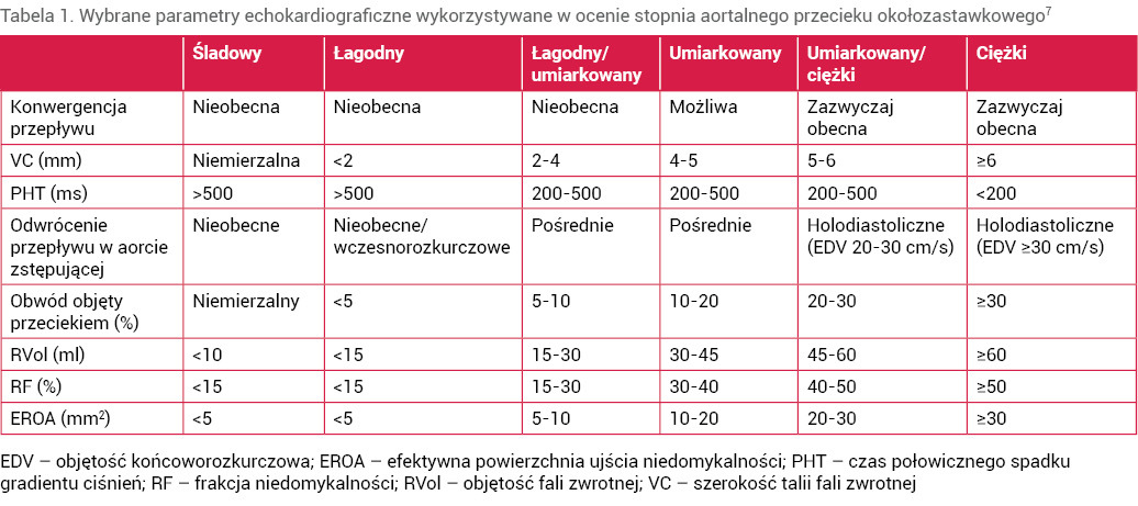 Tabela 1. Wybrane parametry echokardiograficzne wykorzystywane w ocenie stopnia aortalnego przecieku okołozastawkowego7