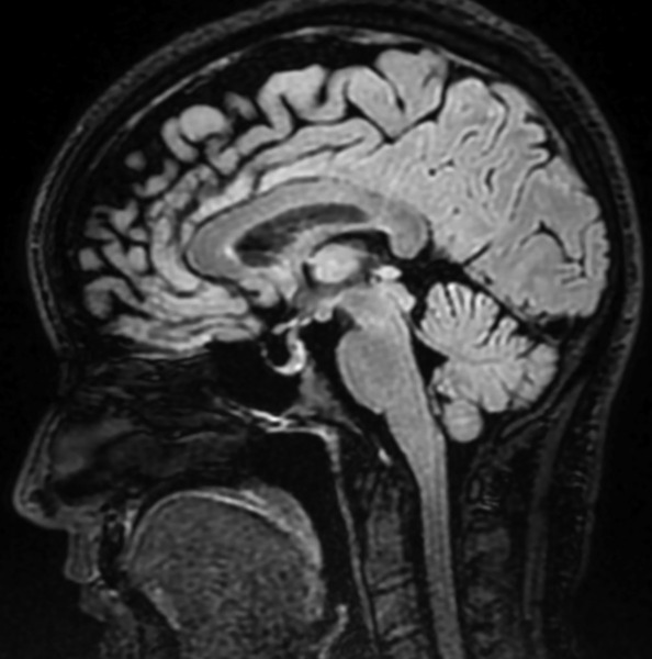 Rycina 1. Rezonans magnetyczny 3D T2 CUBE FLAIR w płaszczyznach strzałkowych – powiększony zbiornik nadsiodłowy