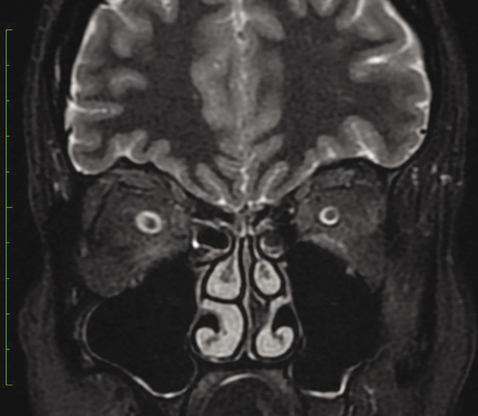 Rycina 2. Rezonans magnetyczny oczodołów STIR w płaszczyznach czołowych – zwiększona ilość płynu w pochewkach nerwów wzrokowych