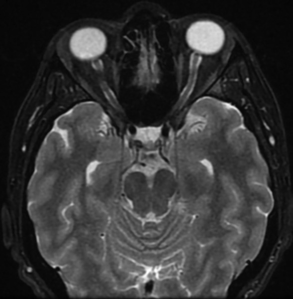 Rycina 3. Rezonans magnetyczny sekwencji T2 FS płaszczyzny poprzecznej oczodołów – zwiększona ilość płynu w pochewkach nerwów wzrokowych