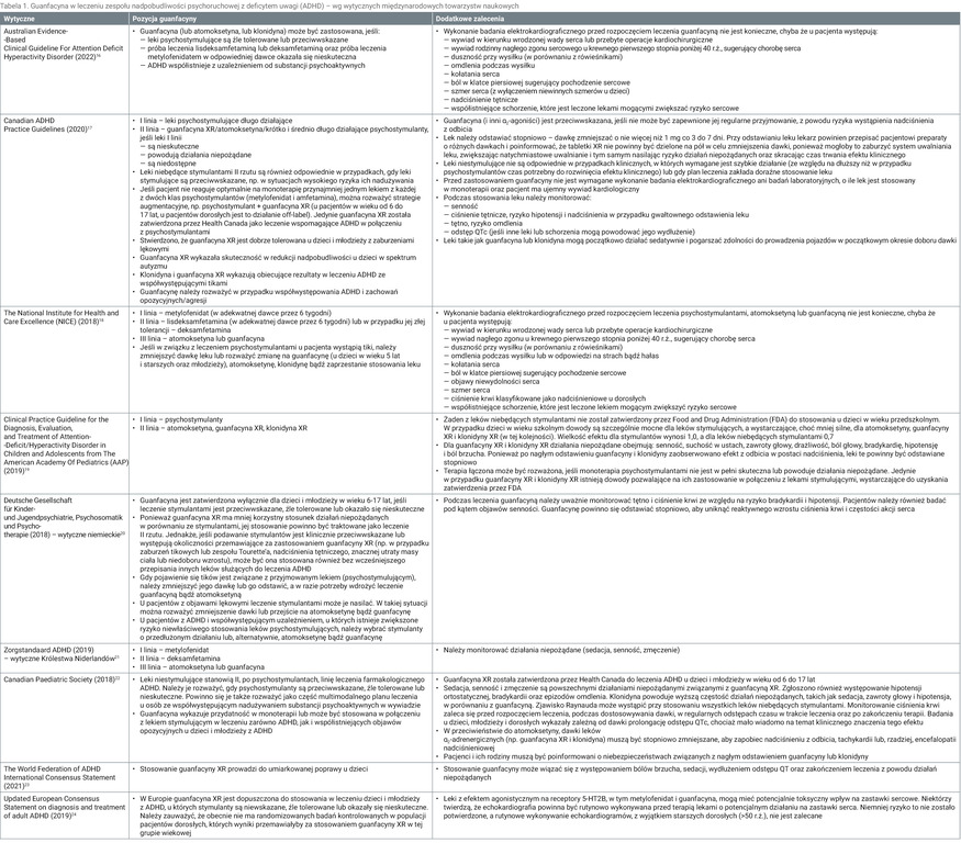 Tabela 1. Guanfacyna w leczeniu zespołu nadpobudliwości psychoruchowej z deficytem uwagi (ADHD) – wg wytycznych międzynarodowych towarzystw naukowych