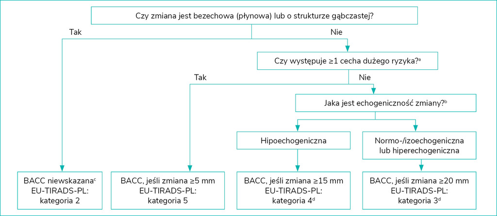 Autorzy przedstawionej wyżej klasyfikacji EU-TIRADS-PL zaproponowali również bardzo czytelny algorytm wykonywania BACC w diagnostyce zmian ogniskowych tarczycy u chorych bez klinicznych cech zwiększonego ryzyka raka tarczycy13,15 (ryc. 1).