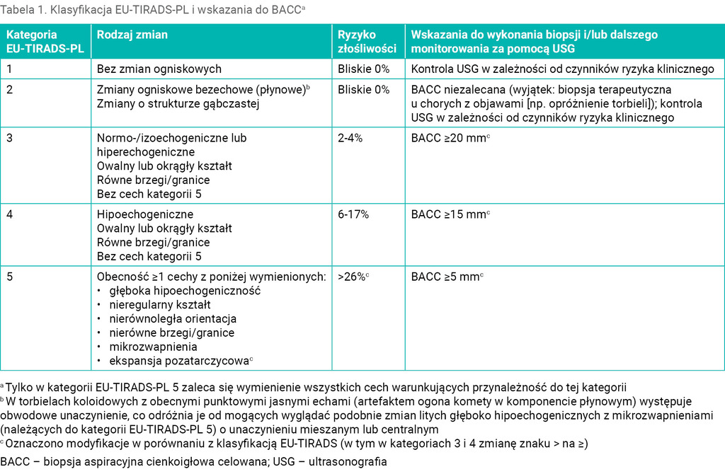 W 2022 roku autorzy rekomendacji Polskich Towarzystw Naukowych (PTN) i Narodowej Strategii Onkologicznej (NSO) zaadaptowali ultrasonograficzną klasyfikację EU-TIRADS (European Thyroid Imaging Reporting and Data System), opracowaną przez European Thyroid Association (ETA)12, i przedstawili nieznacznie zmodyfikowaną klasyfikację EU-TIRADS-PL uwzględniającą uwarunkowania związane z ryzykiem raka tarczycy w populacji polskiej13,14. Klasyfikacja ta jest obecnie podstawowym narzędziem stosowanym do oceny ryzyka złośliwości zmian ogniskowych tarczycy oraz typowania zmian ogniskowych do biopsji lub dalszego monitorowania w ultrasonografii13,15 (tab. 1).