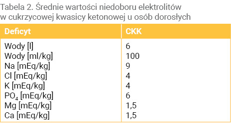 W CKK stwierdzany jest znaczny deficyt wolnej wody i elektrolitów (tab. 2). Stopień odwodnienia i utraty elektrolitów zależy od czasu trwania hiperglikemii, tempa narastania zaburzeń metabolicznych, funkcji nerek i wątroby, a także od ilości i jakości przyjmowanych przez pacjenta płynów i posiłków oraz innych leków, m.in. flozyn i agonistów receptora dla GLP-1.