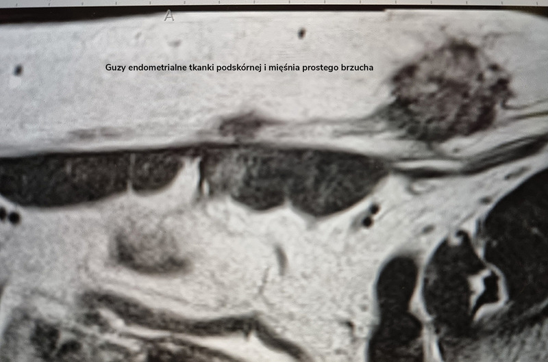 - Spikularne brzegi, heterogeniczność oraz cień akustyczny w hipoechogenicznej zmianie w powłokach brzusznych sugerują endometriozę.