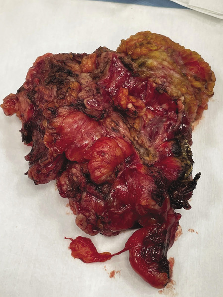 Rycina 5. Guz powłok brzucha po przecięciu zmiany – widoczne ogniska krwotoczne (materiał własny autorki)