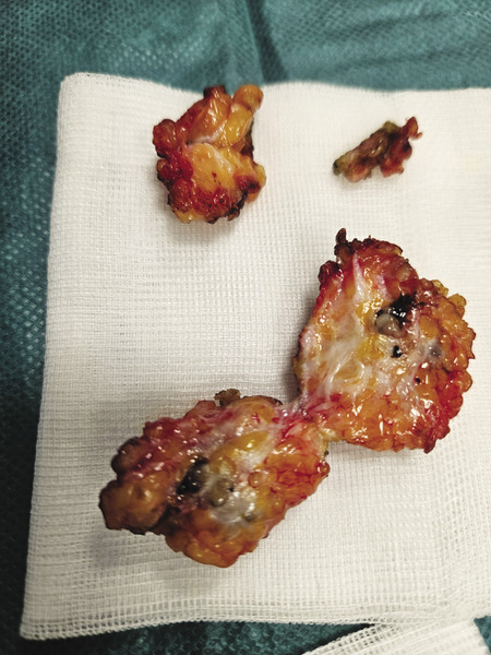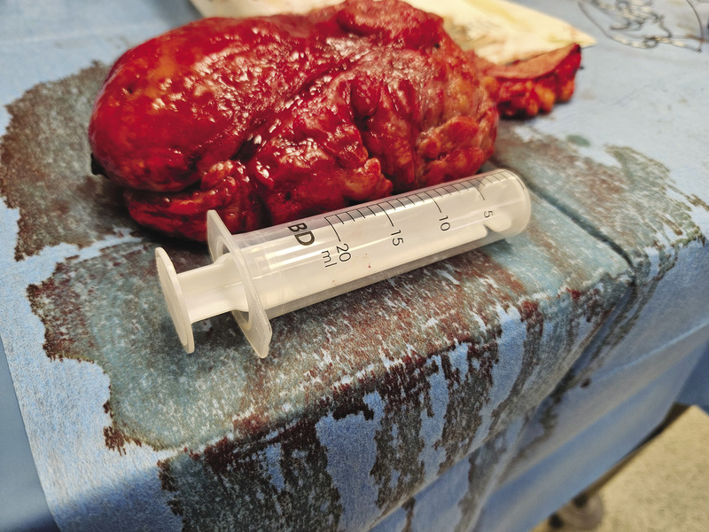 Rycina 4. Guz powłok brzucha po wyłuszczeniu z pogranicza mięśnia prostego brzucha, powięzi i tkanki podskórnej (materiał własny autorki)