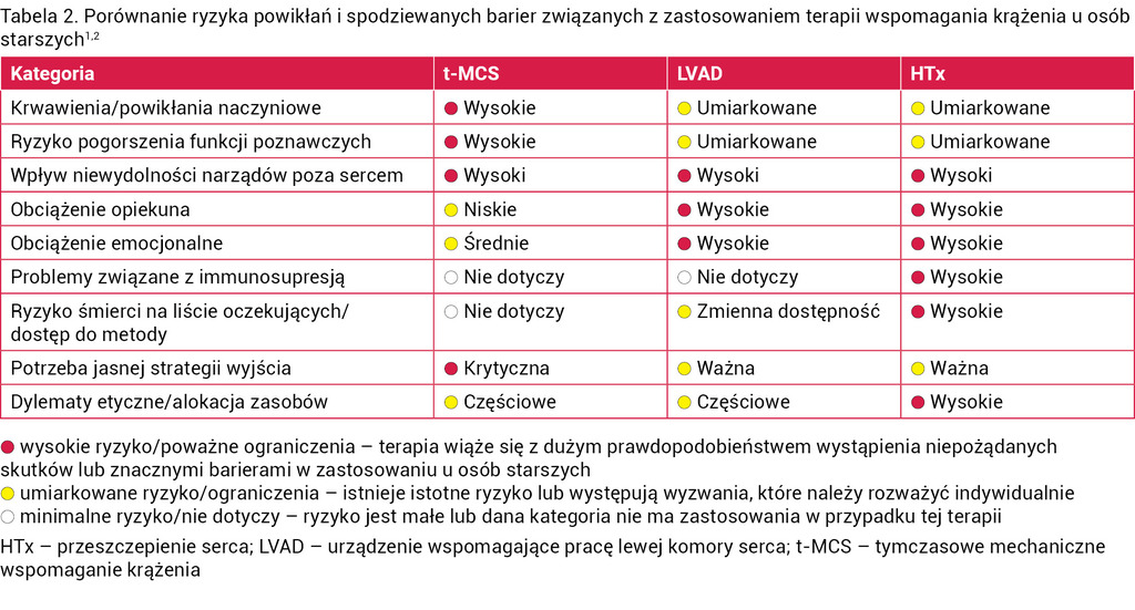 Tabela 2. Porównanie ryzyka powikłań i spodziewanych barier związanych z zastosowaniem terapii wspomagania krążenia u osób starszych1,2