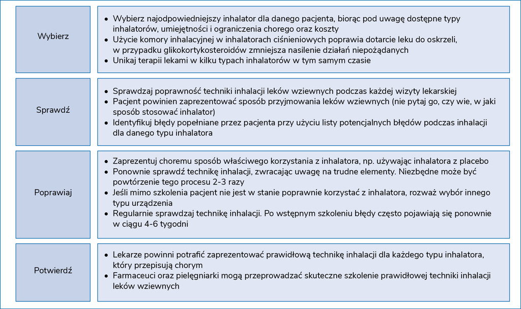 - Rola szkolenia pacjenta z zakresu korzystania z danego typu inhalatora i regularnego monitorowania techniki korzystania z urządzenia