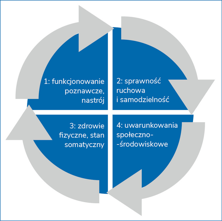 - skupienie uwagi na najważniejszych obszarach: funkcje poznawcze i nastrój, sprawność ruchowa i samodzielność, stan somatyczny oraz czynniki społeczno-środowiskowe
