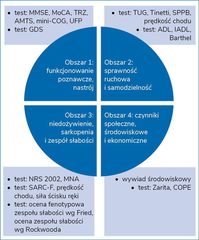 Obszary całościowej oceny geriatrycznej przedstawiono na rycinie 1. W każdym z nich można zastosować wiele narzędzi badawczych (ryc. 2)2. Większość z ujętych na rycinie 2 szczegółowych testów ma zastosowanie w praktyce lekarza geriatry przy drobiazgowej ocenie stanu pacjenta. Dla potrzeb praktyki lekarza rodzinnego poniżej zaproponowano praktyczne podejście w poszczególnych obszarach COG.