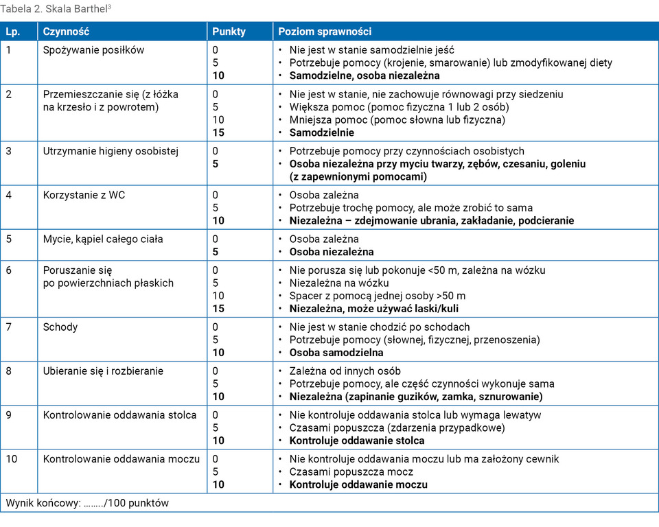 Skalę Barthel zaleca się wykonać w obecności opiekuna (w celu obiektywizacji zgłaszanych informacji) (tab. 2)3. Maksymalny wynik, który można uzyskać, wynosi 100 punktów. Wyższy wynik wskazuje na większą samodzielność badanego. W oryginalnej wersji przyjęto trzy przedziały wyniku skali: