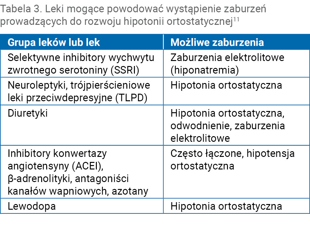 W tabeli 3 zebrano leki, które mogą powodować wystąpienie zaburzeń prowadzących do hipotonii ortostatycznej11.
