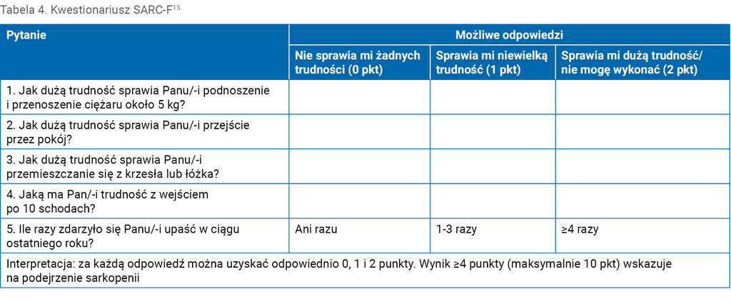 Do diagnostyki sarkopenii w warunkach POZ proponuje się wykonanie testu przesiewowego SARC-F (tab. 4) oraz pomiaru siły uścisku dłoni dynamometrem (ryc. 4). Sarkopenię można podejrzewać u pacjentów, którzy uzyskali co najmniej 4 punkty w kwestionariuszu SARC-F15. Prawdopodobną sarkopenię rozpoznaje się, jeśli dodatkowo wykazano niską siłę ścisku dłoni (poniżej 16 kg u kobiet i 27 kg u mężczyzn), i wówczas można rozpocząć leczenie. Potwierdzenie wymaga wykazania niskiej jakości lub ilości mięśni (badania obrazowe: dwuenergetyczna absorpcjometria rentgenowska [DXA – dual-energy X-ray absorptiometry], tomografia komputerowa [TK], MR) lub w warunkach POZ pomiaru obwodu łydki (wynik <31 cm). Leczenie polega przede wszystkim na stosowaniu ćwiczeń oporowych w połączeniu z podażą białka (minimum 1-1,5 g/kg m.c./24 h).