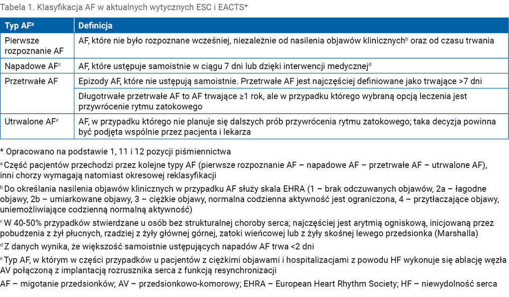 W wytycznych ESC i EACTS z 2024 roku utrzymano klasyfikację AF, która w dużej mierze odnosi się do czasu trwania tej arytmii1. Taka klasyfikacja AF była używana w większości badań nad AF. Odpowiednie zaklasyfikowanie AF pomaga w wyborze strategii terapeutycznej (pozostawienie AF i kontrola HR vs przywrócenie rytmu zatokowego). Typy AF przedstawiono w tabeli 1.