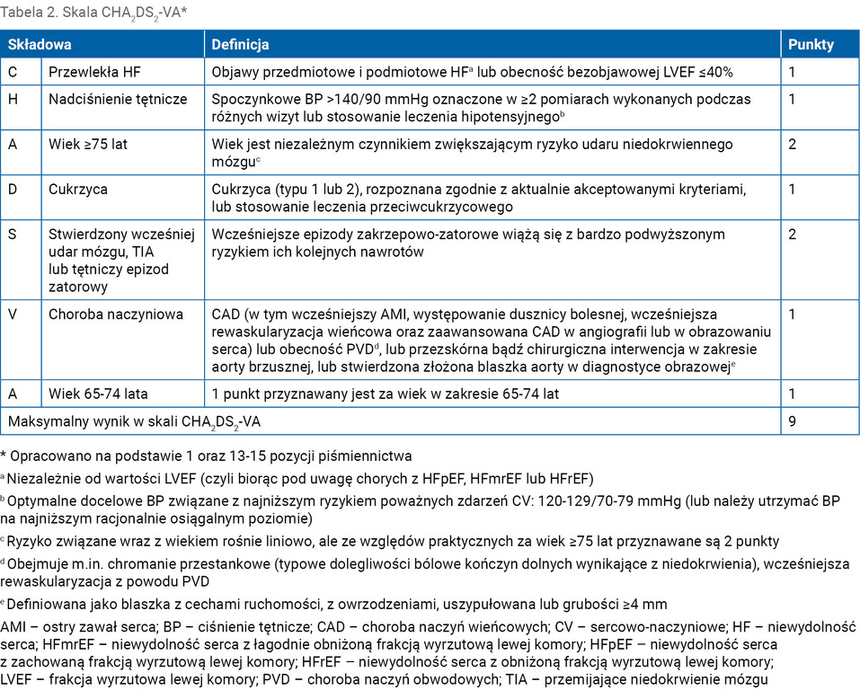 Dużą zmianą w porównaniu z wcześniejszymi wytycznymi jest zalecenie używania do oceny ryzyka zakrzepowo-zatorowego skali CHA2DS2-VA zamiast wcześniej wykorzystywanej skali CHA2DS2-VA-Sc. Skala CHA2DS2-VA zawiera jedną zmienną mniej niż wcześniejsza skala (nie obejmuje informacji o płci). Jest przez to prostsza w użyciu, a uzyskany wynik punktowy łatwiejszy w interpretacji1. Składowe skali CHA2DS2-VA przedstawiono w tabeli 2.