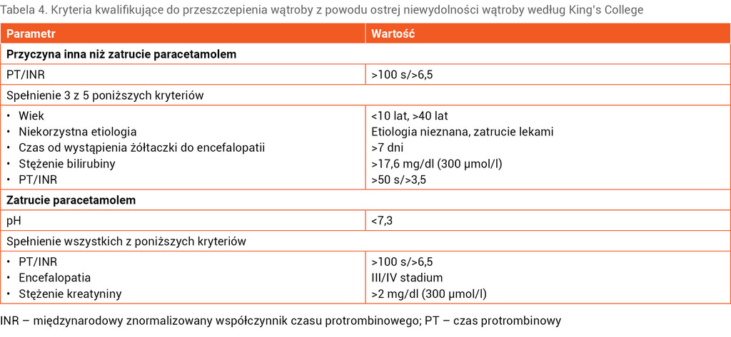 Transplantacja jest wskazana w przypadku braku poprawy mimo stosowanego leczenia. W procesie kwalifikacji do przeszczepienia wątroby stosuje się kryteria Model for End-stage Liver Disease (MELD) u pacjentów powyżej 12 roku życia oraz kryteria Pediatric End-Stage Liver Disease (PELD), obejmujące stężenie bilirubiny, INR, stężenie albumin oraz opóźnienie rozwoju fizycznego, z modyfikacją PELD-Cr uwzględniającą stężenie kreatyniny u dzieci poniżej 12 roku życia11. Skale te są przeznaczone dla pacjentów z przewlekłą niewydolnością wątroby, a nasilenie zaburzeń nie odzwierciedla pilności zabiegu transplantacji. W kwalifikacji do przeszczepienia wątroby wskutek ONW stosuje się kryteria z King’s College (wiek, niekorzystna etiologia, stężenie bilirubiny, czas, jaki upłynął od wystąpienia żółtaczki do rozwoju encefalopatii, PT). Oddzielne kryteria stosuje się u pacjentów po zatruciu paracetamolem i z chorobą Wilsona. Natomiast według Mieli-Vergani w grupie najmłodszych dzieci kryteria powinny obejmować: wiek, INR, stężenie bilirubiny i liczbę leukocytów we krwi. W tabeli 4 zebrano kryteria kwalifikujące do przeszczepienia wątroby z powodu ONW12,13.