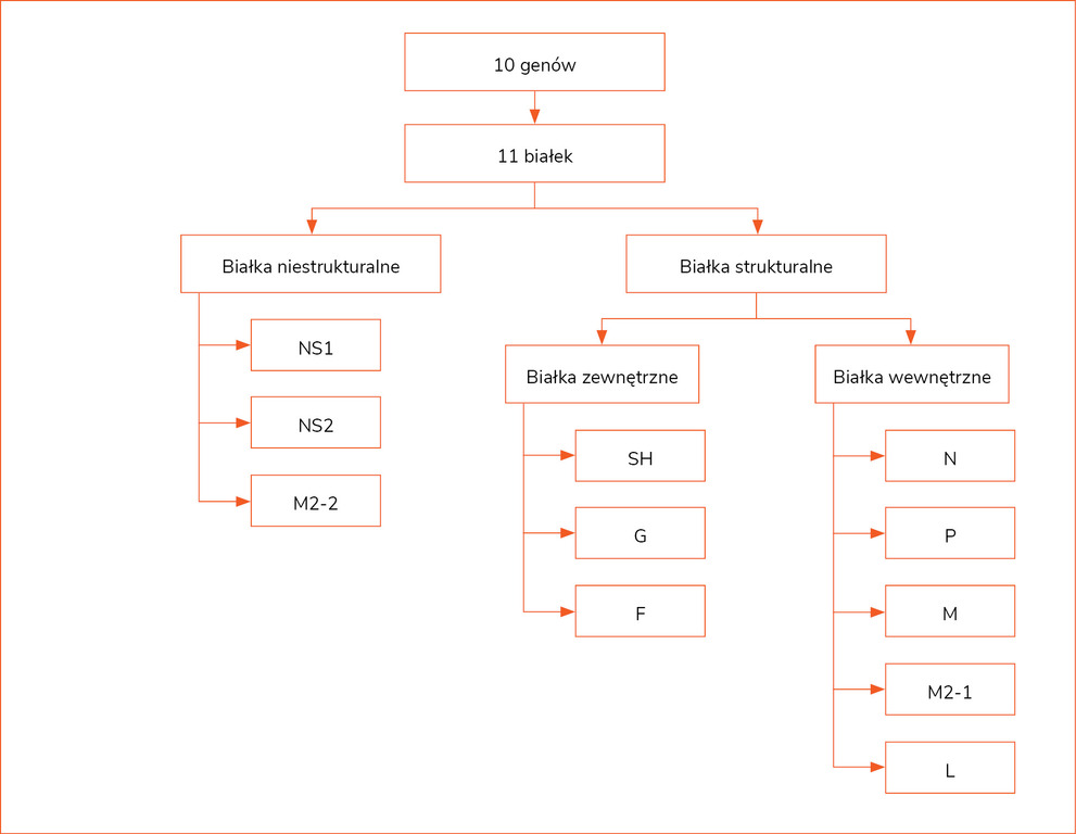 RNA RSV zawiera 10 genów (15 222 nukleotydy), które kodują 11 białek, w tym 3 białka niestrukturalne (NS1, NS2 i M2-2) oraz 8 białek strukturalnych. Z 8 białek strukturalnych 3 znajdują się na powierzchni błony wirusowej – SH (small hydrophobic) i najważniejsze z klinicznego punktu widzenia glikoproteiny G (attachment) i F (fusion). Pięć kolejnych to białka wewnętrzne (N, P, M, M2-1 i L)3 (ryc. 1).