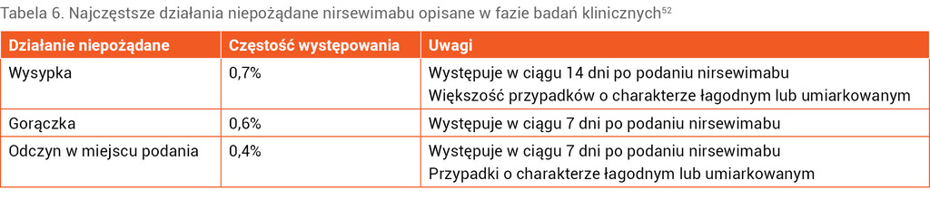 - Włochy – działania niepożądane obserwowane w ciągu 2 tygodni po podaniu nirsewimabu zwykle występowały w pierwszych 48 godz. Objawy te były na ogół łagodne i krótkotrwałe (trwały 1-2 dni). Zgłaszano: gorączkę (6,5%), miejscowe reakcje w miejscu wstrzyknięcia (4%) i nieutulony płacz dziecka (0,4%). Żaden ze zgłoszonych przypadków nie wymagał dodatkowych wizyt lekarskich i nie udokumentowano żadnych przypadków poważnych działań niepożądanych.
