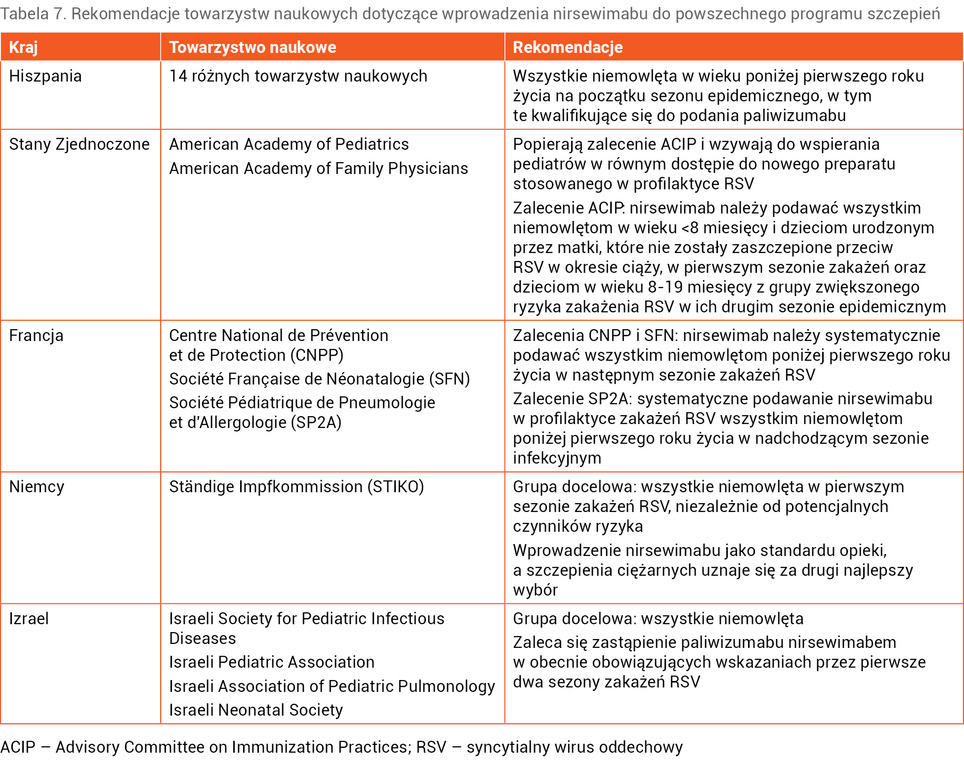 W związku z powyższymi danymi towarzystwa naukowe na całym świecie jednogłośnie rekomendują konieczność wprowadzenia nirsewimabu do obowiązujących programów profilaktycznych. Zalecenia różnią się jedynie populacją docelową, która miałaby otrzymać lek (tab. 7)65-73. W momencie tworzenia niniejszego raportu w Polsce nie wydano jeszcze rekomendacji dotyczących stosowania nirsewimabu.