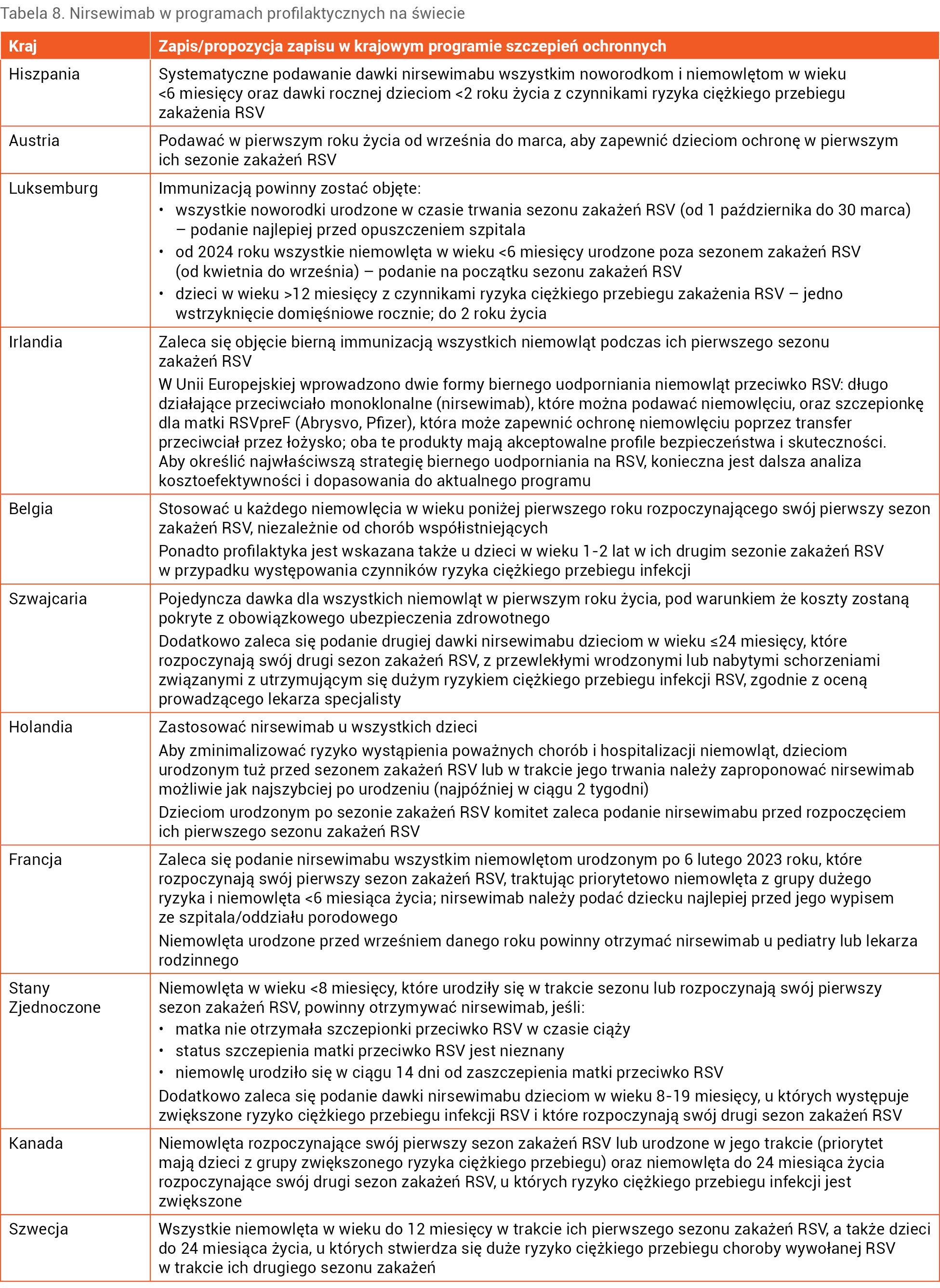 Niektóre z komitetów poruszają temat szczepienia kobiet w ciąży przeciwko RSV. Temat ten jest złożony i jego dyskusja wykracza poza ramy niniejszego opracowania. W Stanach Zjednoczonych (tab. 8) bierze się pod uwagę status matki (według stanu na 31 stycznia 2024 roku wyszczepialność przeciwko RSV w populacji ciężarnych, które od 22 września 2023 roku były w ≥32 tygodniu ciąży, wynosiła 17,6%)87. Podkreślono natomiast, że jeśli kobieta otrzymała już szczepionkę przeciwko RSV w którejkolwiek z poprzednich ciąż, nie zaleca się podawania kolejnej dawki szczepionki przeciwko wirusowi RSV w następnej ciąży. Zamiast tego dziecko powinno otrzymać długo działające przeciwciała przeciwko RSV po urodzeniu55. W stanowisku holenderskim z kolei preferowana jest immunizacja z użyciem nirsewimabu, ponieważ – jak czytamy – „podawanie przeciwciała w sezonie pozwala na ochronę przed zakażeniem RSV większej części dzieci niż w wyniku podania szczepienia matce, jako że część z tych dzieci rodzi się poza sezonem, a skuteczność szczepienia zmniejsza się do czasu rozpoczęcia pierwszego sezonu zakażeń RSV. Dzieciom tym można następnie podać przeciwciała, ale oznacza to utworzenie dwóch programów. [...] Dzięki nirsewimabowi można byłoby osiągnąć większe korzyści zdrowotne”.