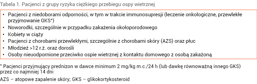 Należy pamiętać, że u pacjentów z grup ryzyka ciężkiego przebiegu ospy wietrznej (tab. 1) obraz kliniczny może być odmienny, a przebieg wiązać się z ryzykiem śmierci, zatem trzeba zwrócić na nich szczególną uwagę.