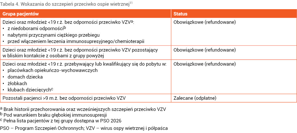 Szczepienia są zalecane wszystkim osobom bez odporności przeciwko ospie wietrznej. W wybranych grupach są one obowiązkowe i finansowane przez Narodowy Fundusz Zdrowia. Grupy pacjentów objętych szczepieniami obowiązkowymi publikowane są corocznie w Programie Szczepień Ochronnych (PSO) (wybrane wskazania przedstawiono w tabeli 4)11.