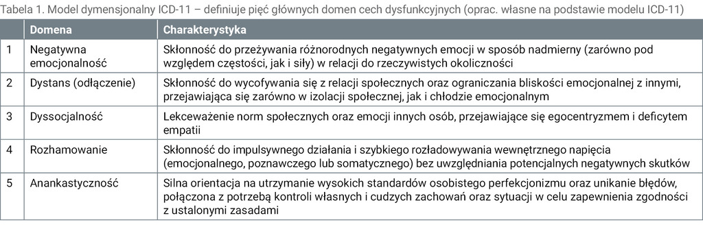 Tabela 1. Model dymensjonalny ICD-11 – definiuje pięć głównych domen cech dysfunkcyjnych (oprac. własne na podstawie modelu ICD-11)