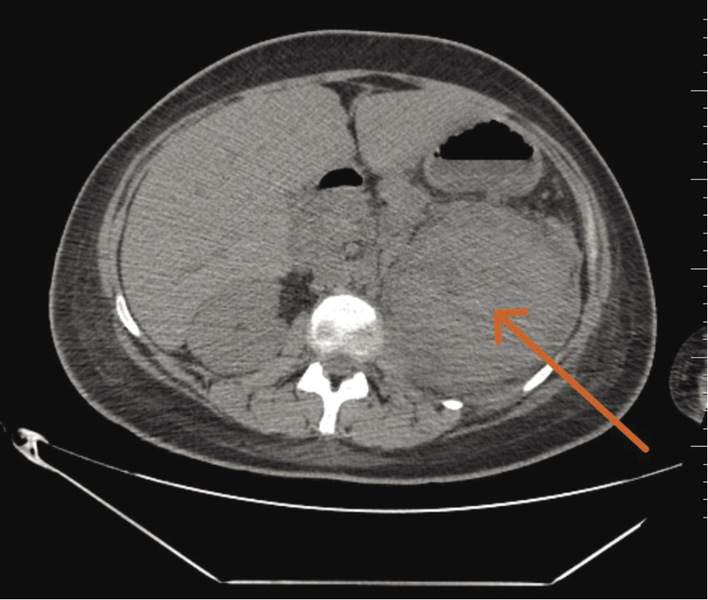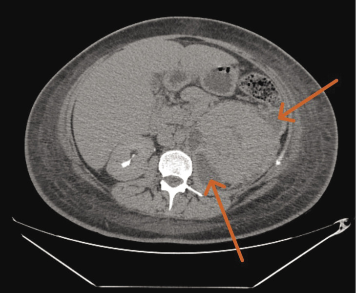W trzeciej dobie pobytu na oddziale diagnostykę poszerzono o 4-fazową TK jamy brzusznej. Na jej podstawie stwierdzono utrzymujące się powiększenie lewej nerki, bez widocznego zróżnicowania miąższu, z prawdopodobnymi obszarami rozpadu (ryc. 2). Nerka otoczona była płynem oraz pogrubiałymi blaszkami powięzi. Dostrzeżono ponadto zbiornik płynowy wielkości 33 × 17 × 48 mm w obrębie powiększonego lewego mięśnia lędźwiowego większego. Podobną zmianę o charakterze patologicznego zbiornika płynowego stwierdzono w okolicy zgięcia śledzionowego kątnicy. W posiewach krwi i moczu zaobserwowano wzrost bakterii Escherichia coli – szczep pozostawał wrażliwy na ceftriakson (dotychczasową antybiotykoterapię utrzymano).