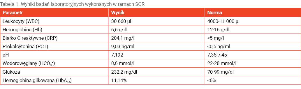 W ramach SOR przeprowadzono diagnostykę laboratoryjną oraz obrazową. W wynikach badań laboratoryjnych (tab. 1) zaobserwowano podwyższone wartości wykładników stanu zapalnego, ciężką niedokrwistość oraz kwasicę metaboliczną. Co więcej, uwagę zwracały hiperglikemia oraz wysokie stężenie hemoglobiny glikowanej (HbA1c), a w badaniu ogólnym moczu – glukozuria, liczne bakterie i leukocyty oraz obecność ciał ketonowych.