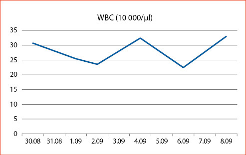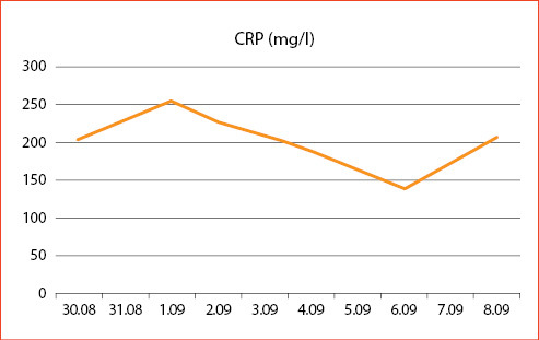 Pomimo początkowego spadku wartości wykładników stanu zapalnego w dziewiątej dobie leczenia ponownie pojawiła się tendencja wzrostowa (ryc. 3 i 4). Pobrano kontrolny zestaw posiewów. Za pomocą badania ultrasonograficznego (USG) jamy brzusznej uzyskano obraz lewej nerki: wymiary: 20 × 10,5 × 12 cm, zatarte zarysy, całkowicie zatarta granica korowo-rdzeniowa. Układ kielichowo-miedniczkowy nieposzerzony. Nie uwidoczniono zmian ogniskowych mogących odpowiadać ropniom. Chorą konsultowano urologicznie – bez wskazań do leczenia operacyjnego. Zalecono modyfikację antybiotykoterapii. Włączono dożylny meropenem (2 g co 8 godz.).