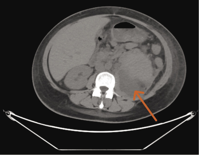 W efekcie działań prowadzonych w osiemnastej dobie leczenia stwierdzono stopniową normalizację parametrów nerkowych. W związku z utrzymującymi się wysokimi wartościami wykładników stanu zapalnego przeprowadzono kontrolną jednofazową TK jamy brzusznej, w której poniżej dolnego bieguna nerki lewej zaobserwowano obszar gęstopłynowy (79 × 68 × 89 mm) wychodzący z powiększonego lewego mięśnia lędźwiowego większego, przylegający do dolnej i przyśrodkowej części nerki (ryc. 5). Pacjentkę ponownie skonsultowano urologicznie i zakwalifikowano do drenażu patologicznego zbiornika płynowego. W wyniku nakłucia obszaru gęstopłynowego uzyskano wypływ 300 ml treści ropnej. W kontrolnej TK przeprowadzonej po drenażu nie stwierdzono obecności patologicznych zbiorników płynowych.