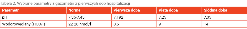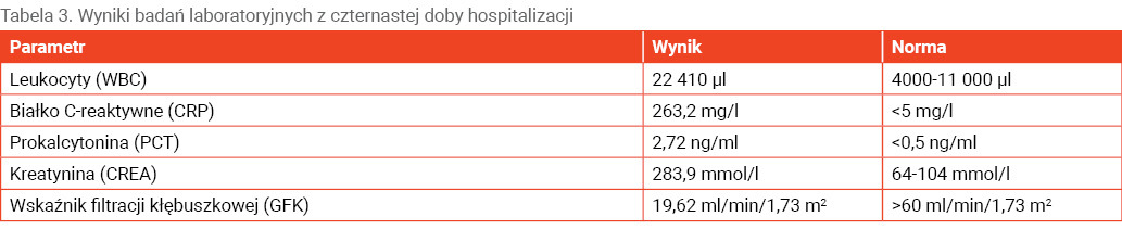Pomimo prowadzonego wielokierunkowego leczenia specjalistycznego w czternastej dobie pobytu na oddziale zaobserwowano nagłe pogorszenie stanu zdrowia chorej. W badaniu przedmiotowym stwierdzono hipotensję mimo adekwatnej płynoterapii. Co więcej, obserwowano narastające obrzęki obwodowe oraz anurię. W kontrolnym badaniach laboratoryjnych uwidoczniono cechy ostrego uszkodzenia nerek oraz ponowny wzrost wartości wykładników stanu zapalnego (tab. 3). W związku z obrazem postępującej niewydolności wielonarządowej pacjentkę konsultowano anestezjologicznie – odstawiono ampicylinę, ponownie wdrożono do leczenia meropenem w dawce dostosowanej do czynności filtracyjnej nerek, włączono wlew ciągły z noradrenaliny, zintensyfikowano leczenie moczopędne oraz zastosowano dożylną suplementację albumin.