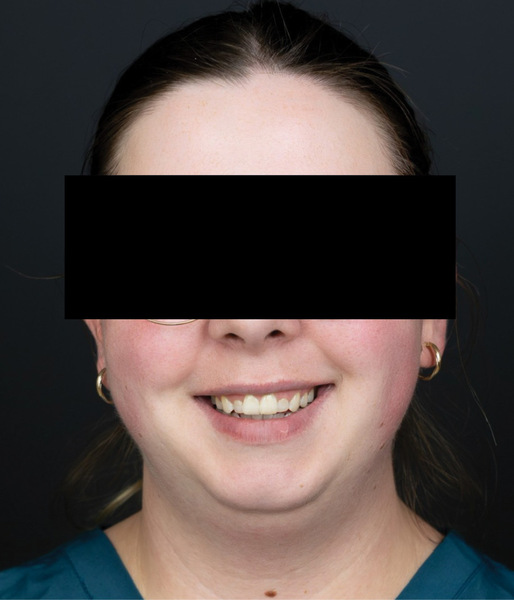 U omawianej pacjentki osiągnięto zadowalający efekt minimalizacji napięcia mięśni mimicznych. Uzyskany efekt był symetryczny, nie odnotowano powikłań. Dzięki zmniejszeniu aktywności mięśni odpowiedzialnych za powstawanie uśmiechu dziąsłowego udało się zmniejszyć obszar widocznego dziąsła w czasie uśmiechu. Pozwoliło to na skorygowanie i upiększenie uśmiechu, a co za tym idzie na harmonizację i odmłodzenie twarzy oraz znaczną poprawę samopoczucia pacjentki (ryc. 5).